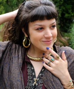 O Anel Sushant é um design étnico bastante trabalhado com um cristal ao centro em forma de lágrima. Feito em latão, é muito elegante e causa impacto em qualquer mão. Podes conjugá-lo com outros anéis simples ou usa-lo só. Também podes combina-lo com pulseiras e brincos em latão.