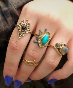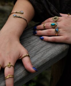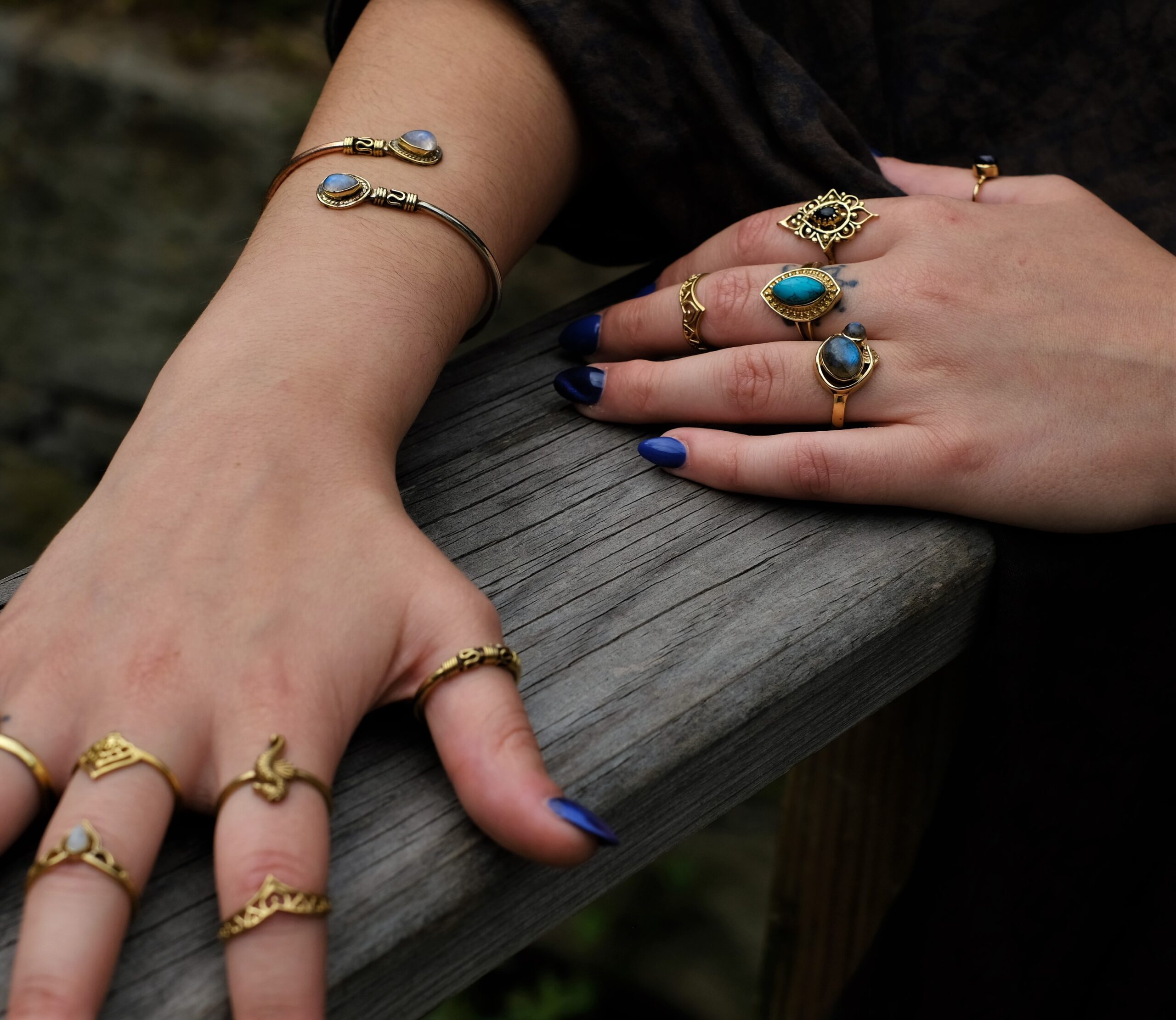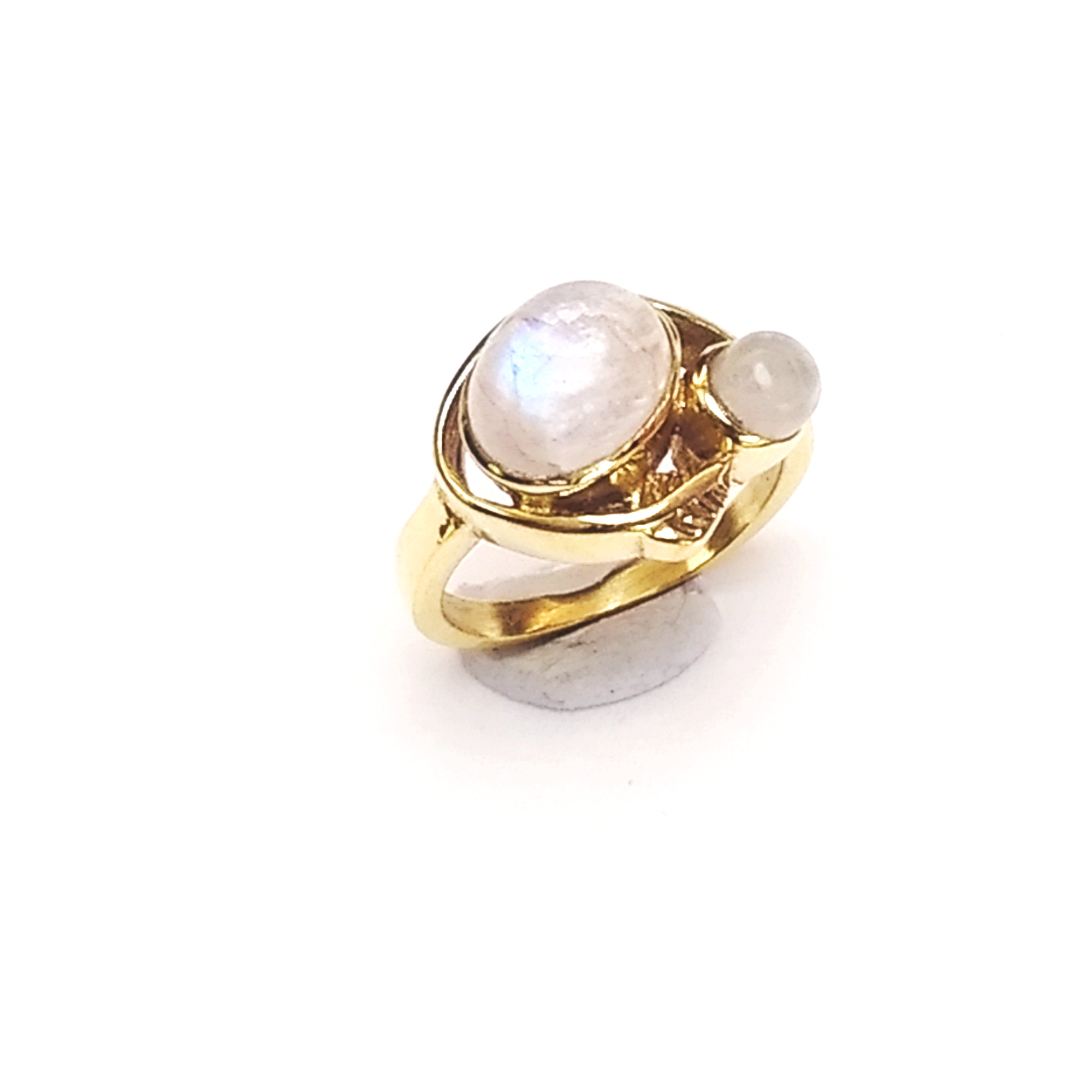 O Anel Langar é um design assimétrico com duas lindas Pedras da Lua. Simples e elegante, pode ser combinados com pulseiras e brincos de Pedra da Lua. Feito em Latão.