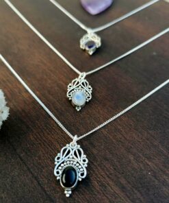 O Colar Chusi é único. Inspirado nas linhas da Flor de Liz, o resultado foi este lindo pendente desenhado a partir de um cristal redondo. É um design único, diferente e com muito requinte. O colar é composto pelo pequeno pendente e uma corrente delicada com 1mm de espessura. Toda a peça é feita em prata 925. Está disponível com Labradorite, Olho de Tigre, Ónix Preta e Pedra da Lua. Escolhe a tua favorita! Podes combinar esta peça com qualquer um dos anéis de prata da coleção Adixi.