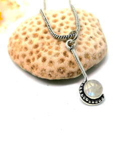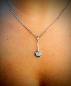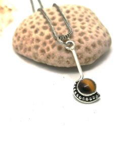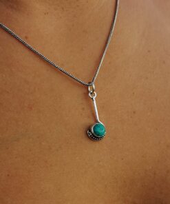 O colar Lambar tem um design único. O pendente é pequeno, alongado e assimétrico. Super delicado, para usar chegado ao pescoço. É feito em latão e banhado a prata, e podes combina-lo com as nossas pulseiras de pedra.