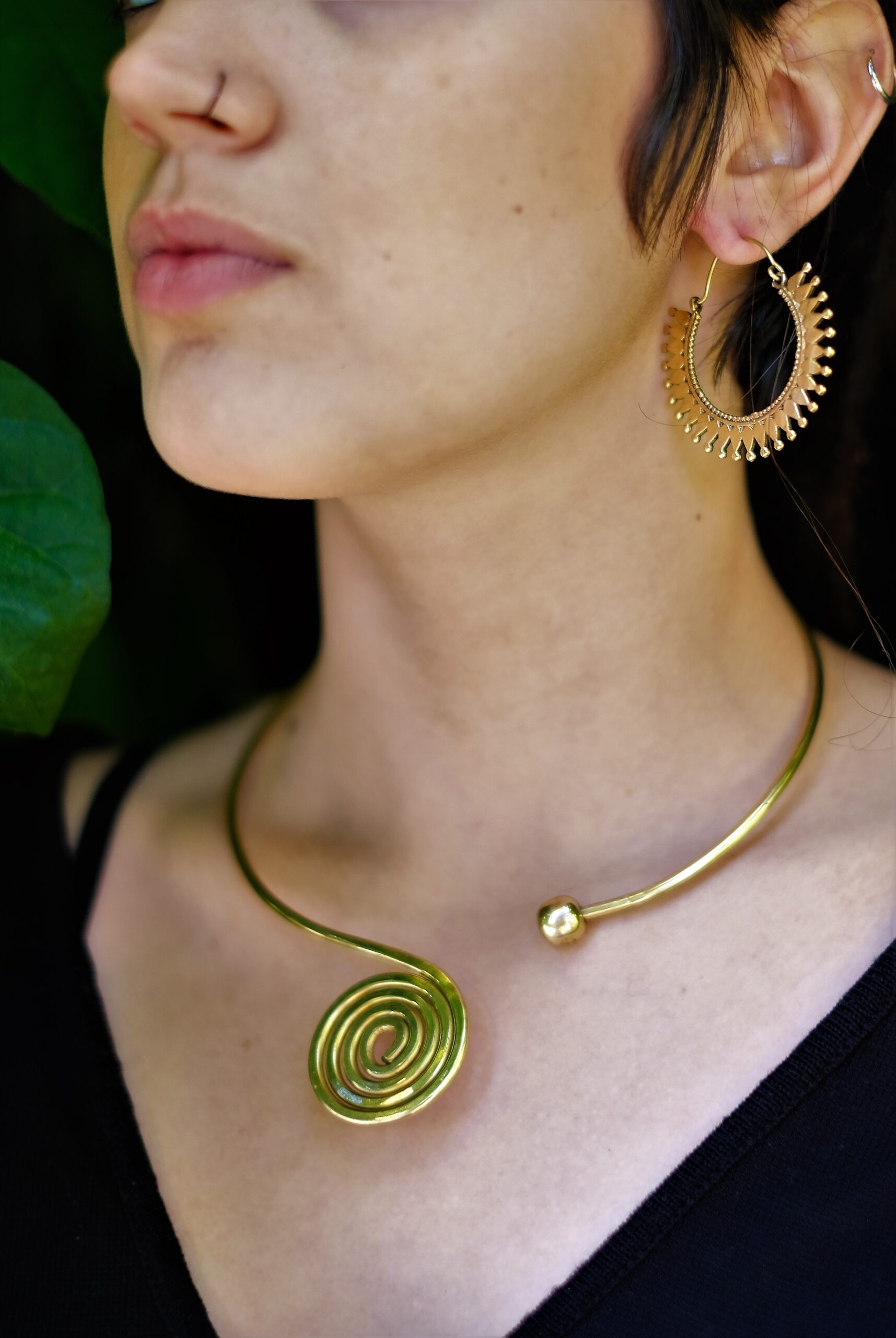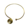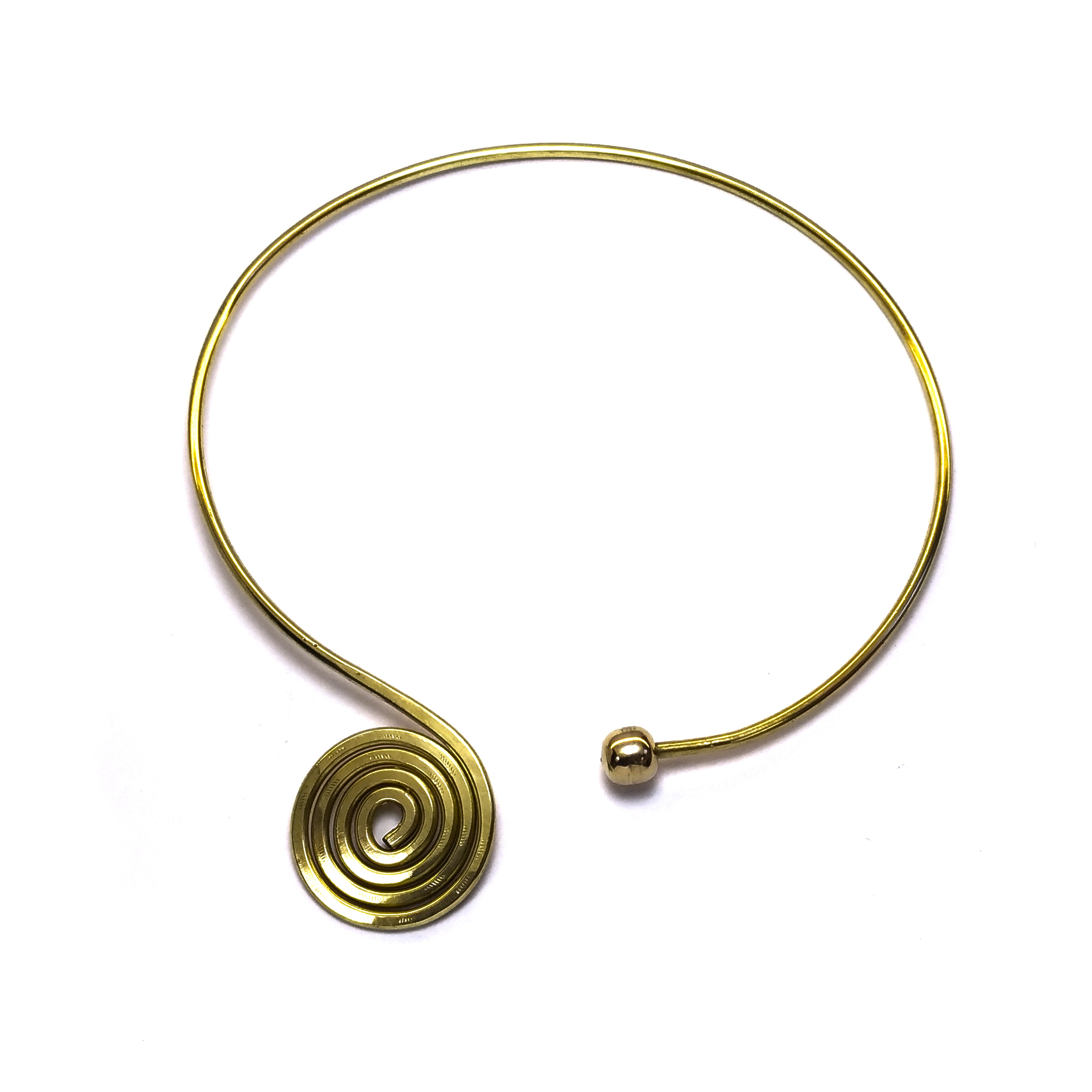 O colar Ansu é uma gargantilha feita artesanalmente em latão, minimal e irreverente. De inspiração celta, este design é assimétrico com uma espiral na extremidade. Confortável e ajustável, pode ser combinada com outros brincos, anéis e pulseiras de latão