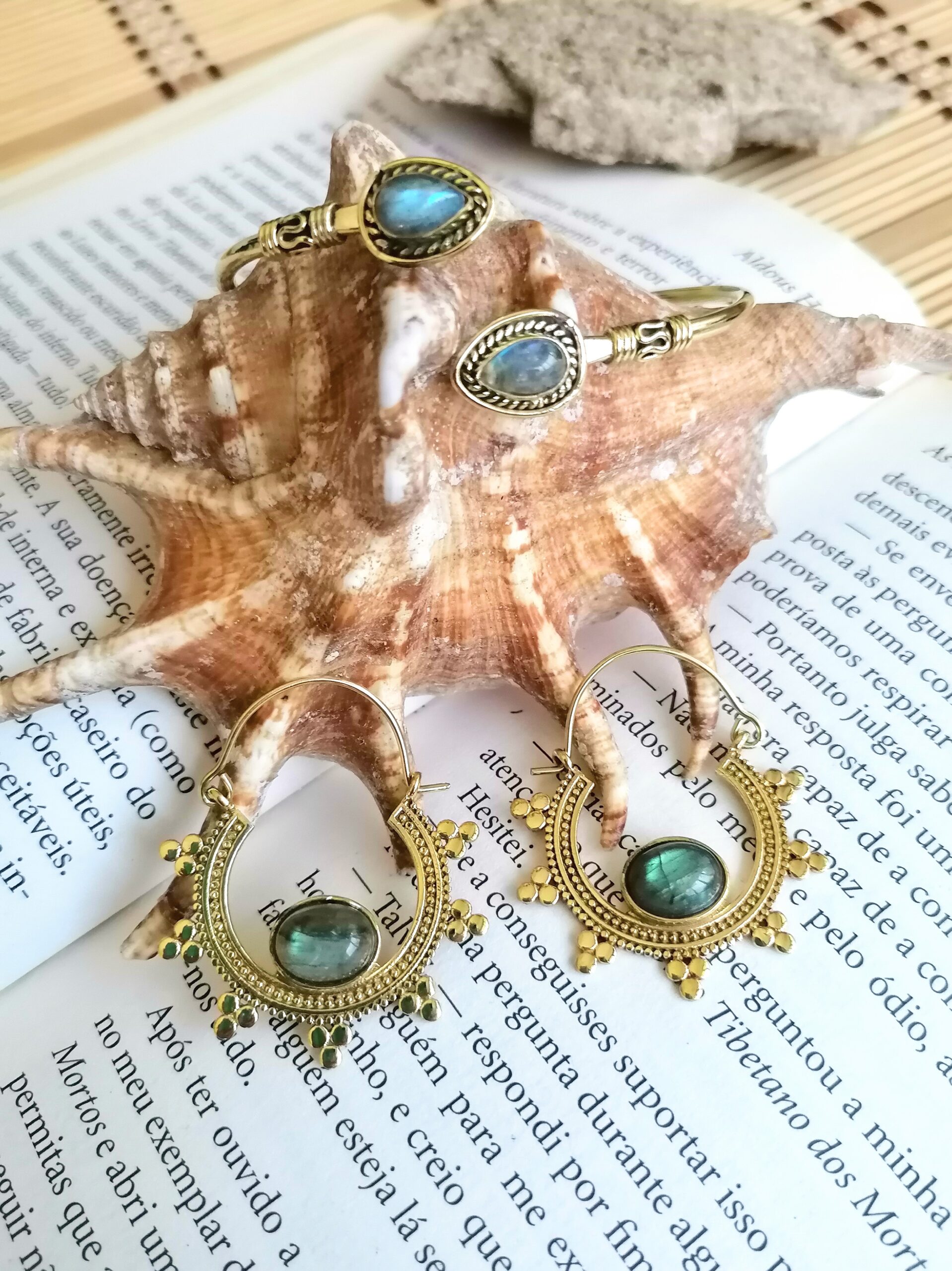 Conjunto único e exclusivo. Composto por estes lindos brincos de design étnico, e por esta pulseira de inspiração celta. Ambos feitos em latão com cristal labradorite de qualidade. Apenas um conjunto em stock!