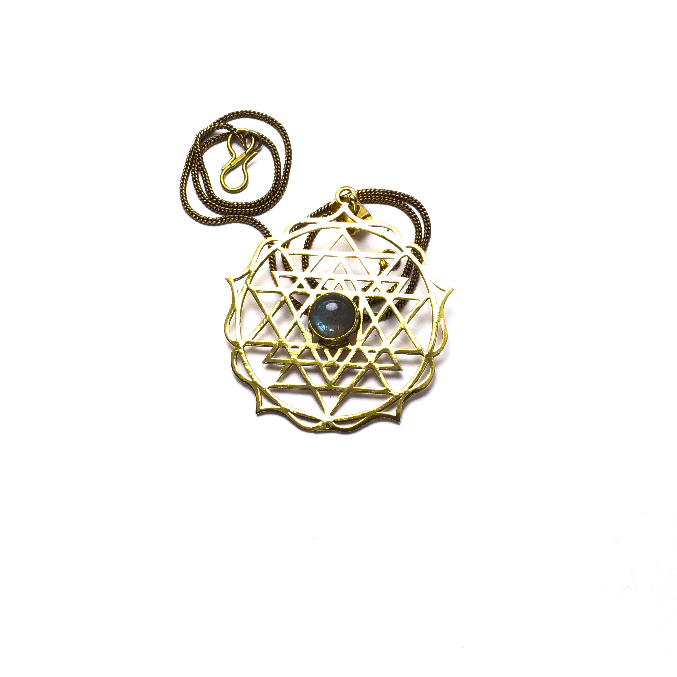 O colar Sri Yantra é muito delicado e bem Desenhado. Uma mandala desenha um sri Yantra no qual se encontra um cristal ao centro. O Sri Yantra é um símbolo da geometria sagrada e um poderoso instrumento de meditação e libertação espiritual, união entre o mundo físico e espiritual. Colar todo feito em latão e banhado em prata.