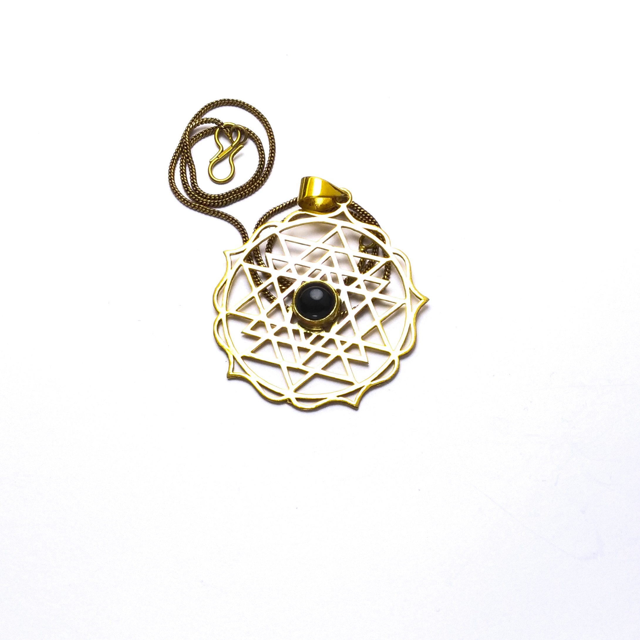 O colar Sri Yantra é muito delicado e bem Desenhado. Uma mandala desenha um sri Yantra no qual se encontra um cristal ao centro. O Sri Yantra é um símbolo da geometria sagrada e um poderoso instrumento de meditação e libertação espiritual, união entre o mundo físico e espiritual. Colar todo feito em latão e banhado em prata.