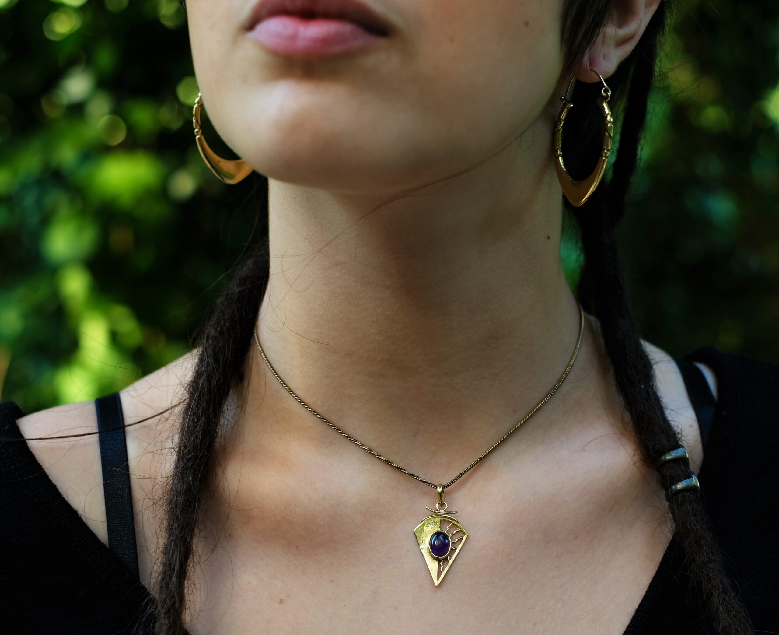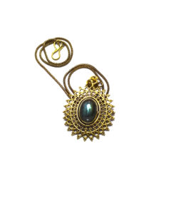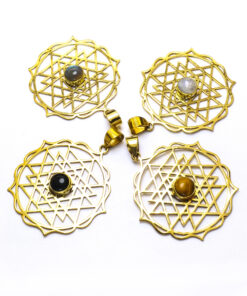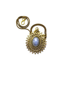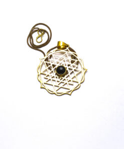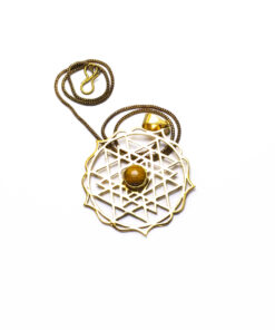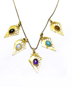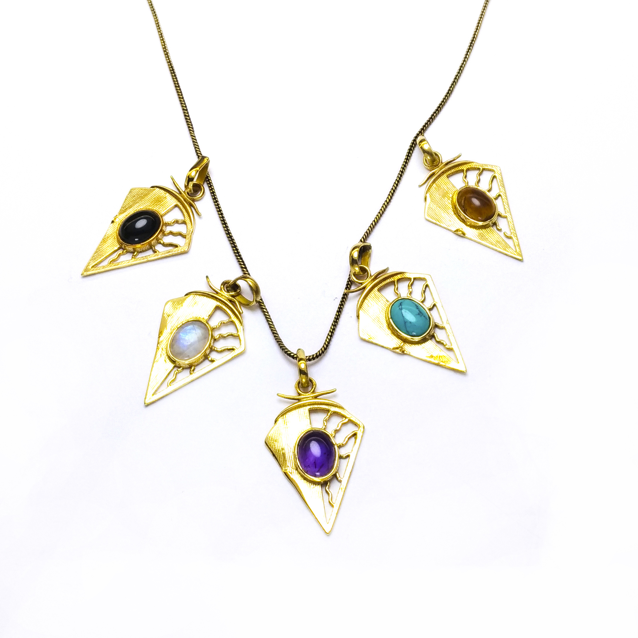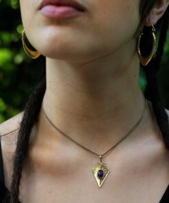 O colar Sunjay é muito design de inspiração celta. Representa o sol e a lua, o dia e a noite. Pontiagudo e com um lindo cristal ao centro, este lindo pendente é irreverente e delicado. Feito artesanalmente em latão.