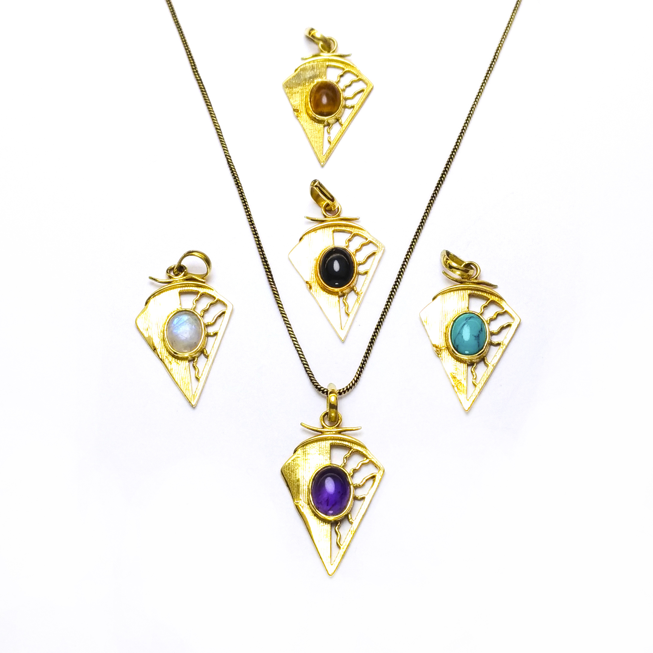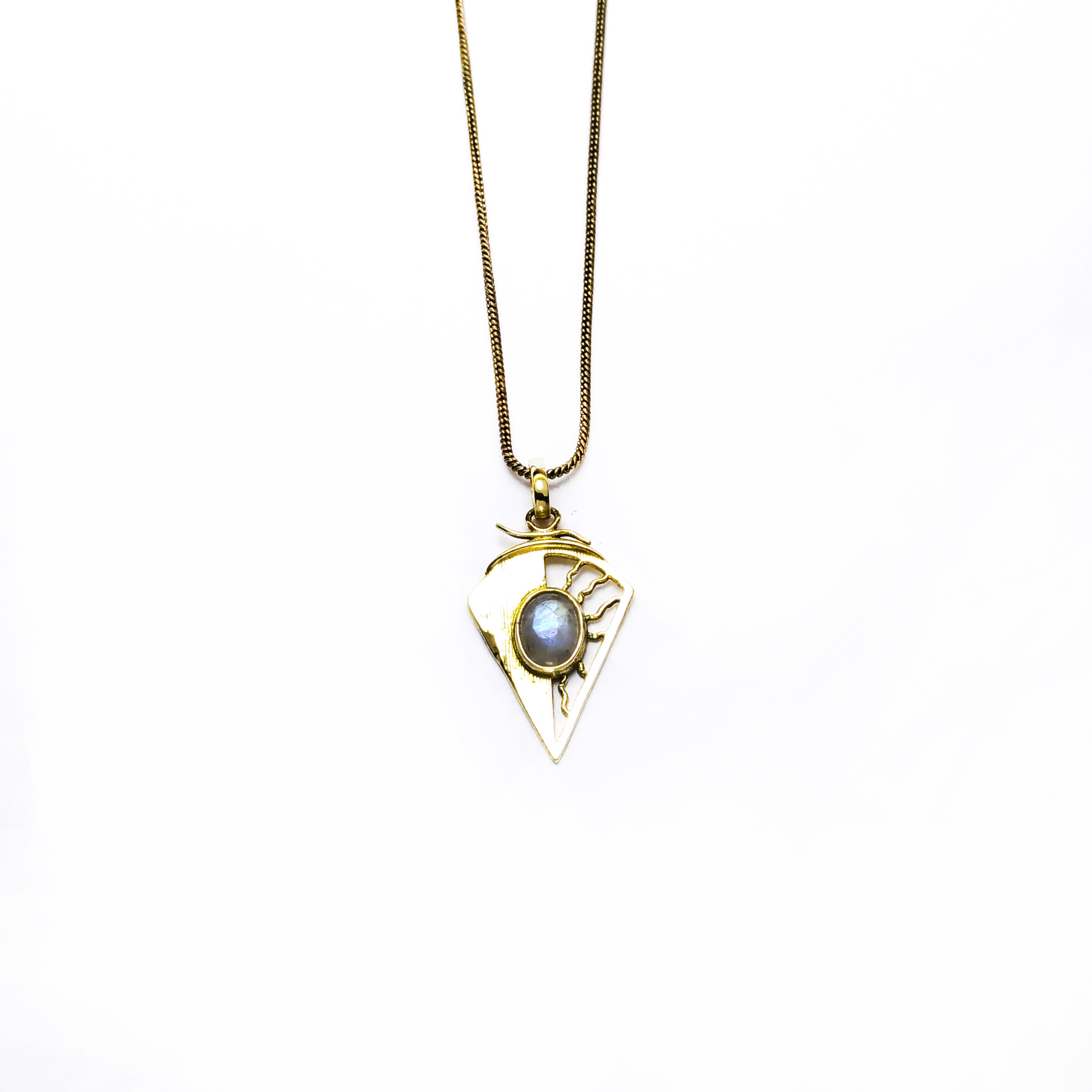 O colar Sunjay é muito design de inspiração celta. Representa o sol e a lua, o dia e a noite. Pontiagudo e com um lindo cristal ao centro, este lindo pendente é irreverente e delicado. Feito artesanalmente em latão.