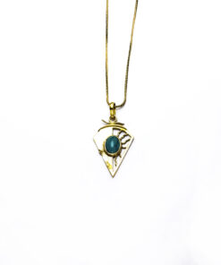 O colar Sunjay é muito design de inspiração celta. Representa o sol e a lua, o dia e a noite. Pontiagudo e com um lindo cristal ao centro, este lindo pendente é irreverente e delicado. Feito artesanalmente em latão.