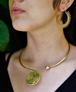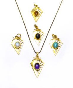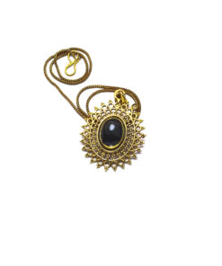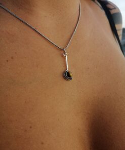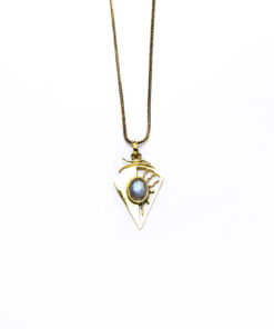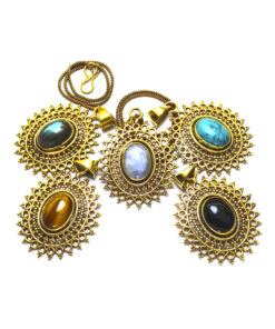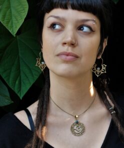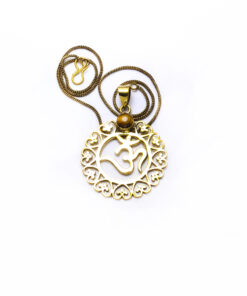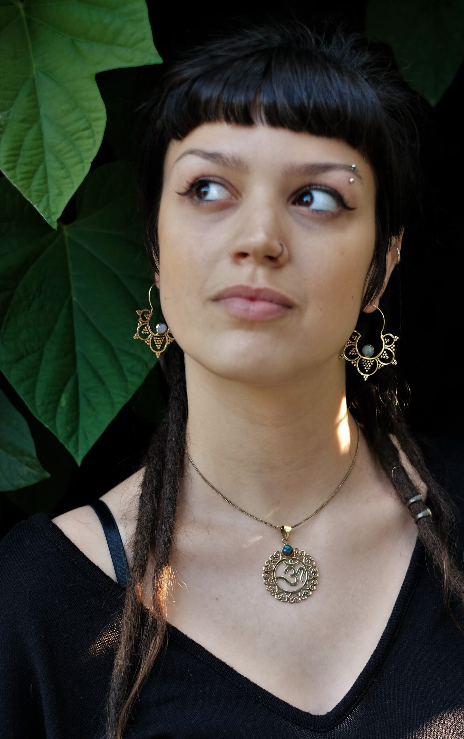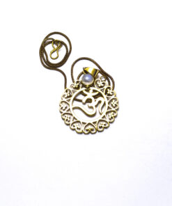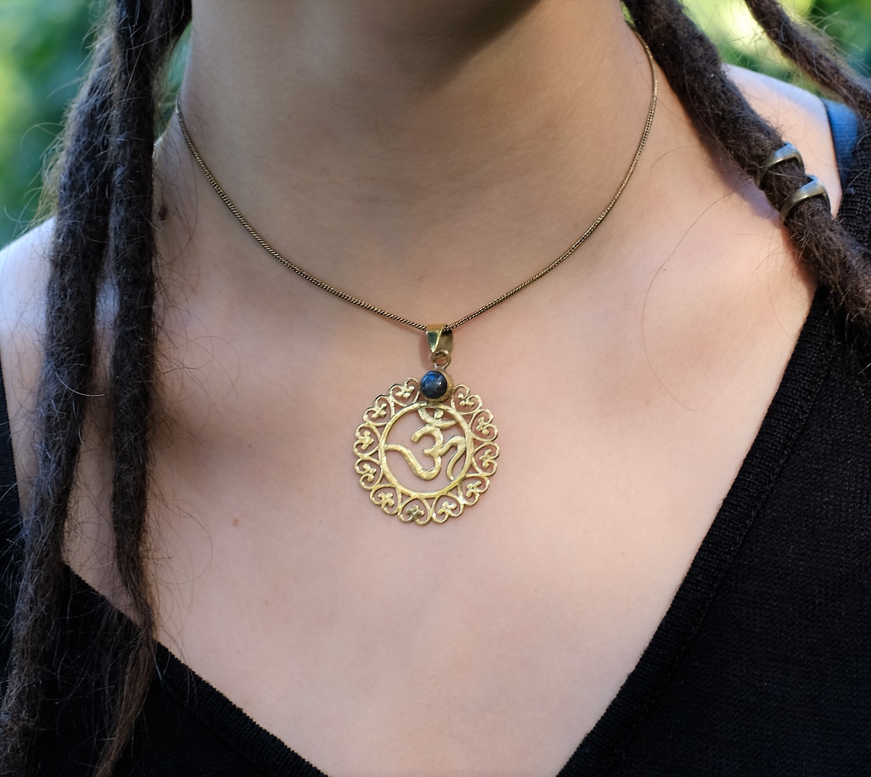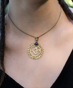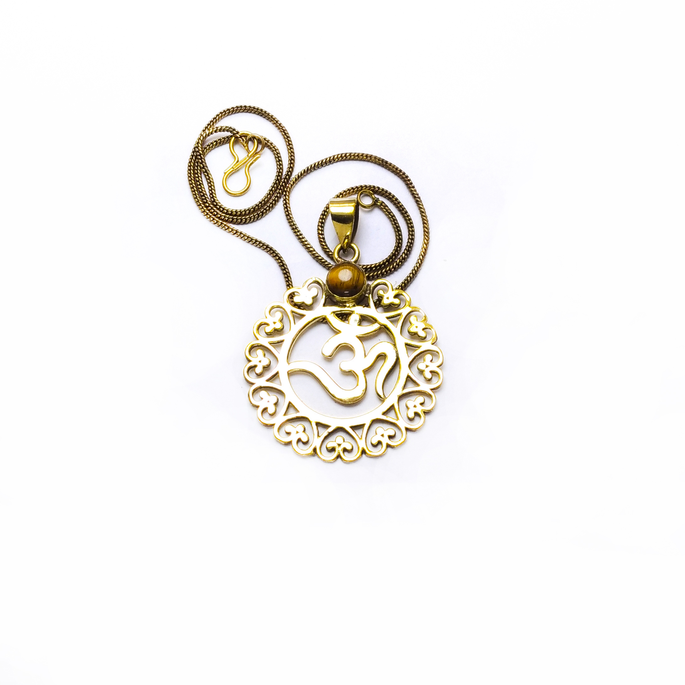 Colar composto por pendente redondo com um Om ao centro e um cristal no Topo. O Om para além de um poderoso mantra, representa na cultura Hindu, conexão com os deuses. Colar todo feito em latão.