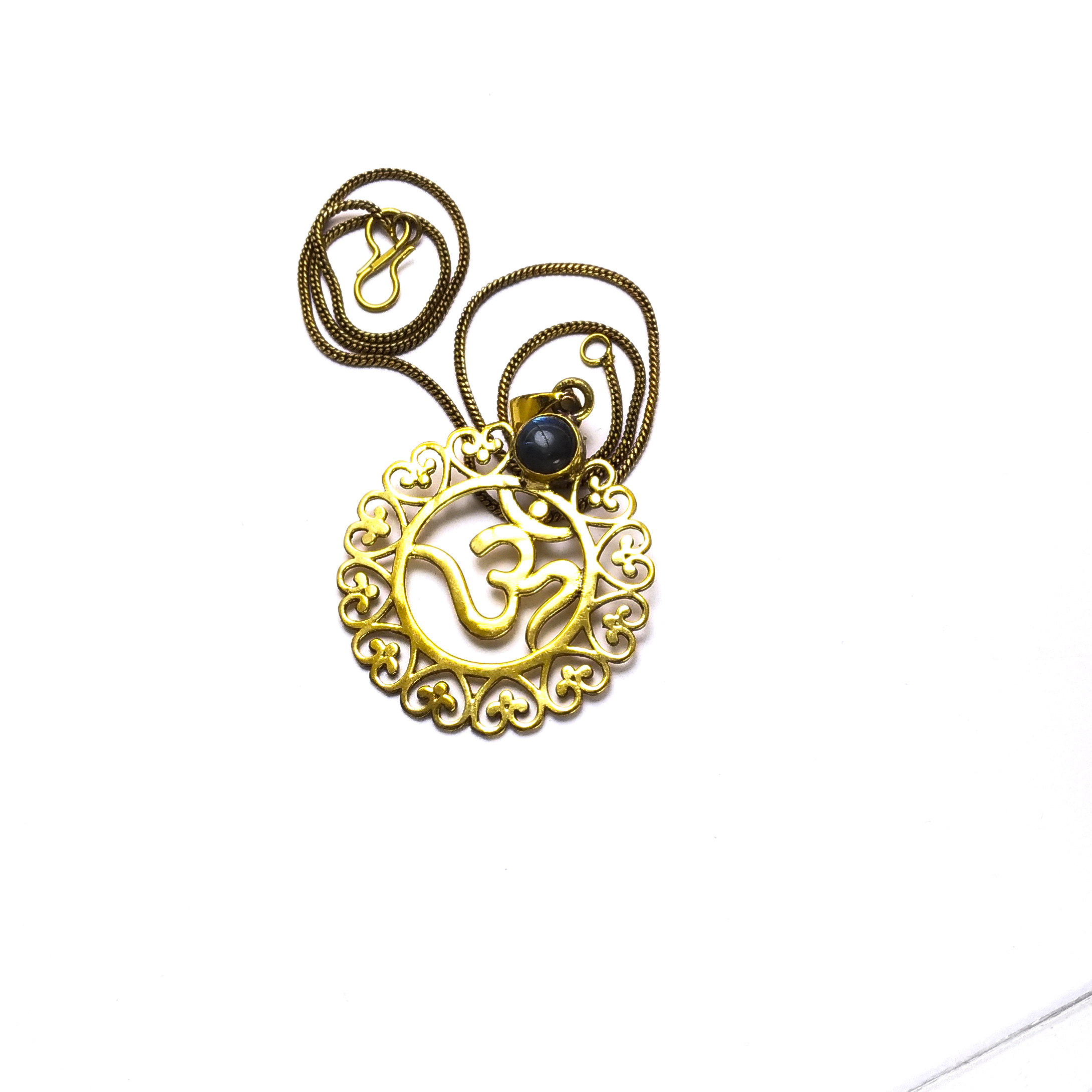 Colar composto por pendente redondo com um Om ao centro e um cristal no Topo. O Om para além de um poderoso mantra, representa na cultura Hindu, conexão com os deuses. Colar todo feito em latão.