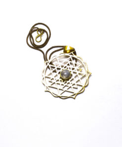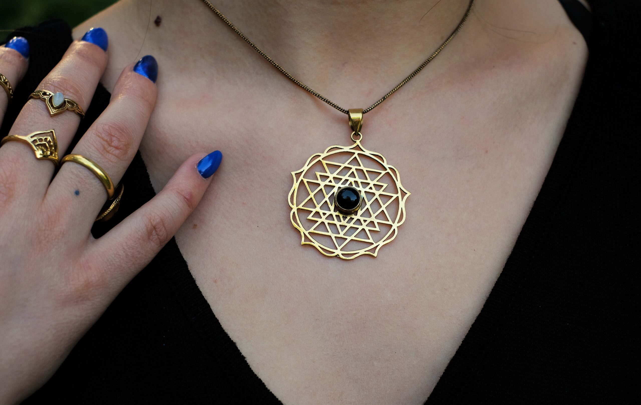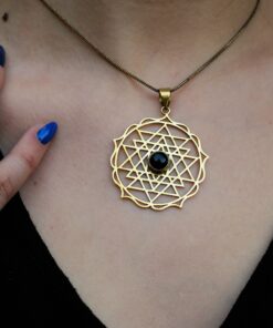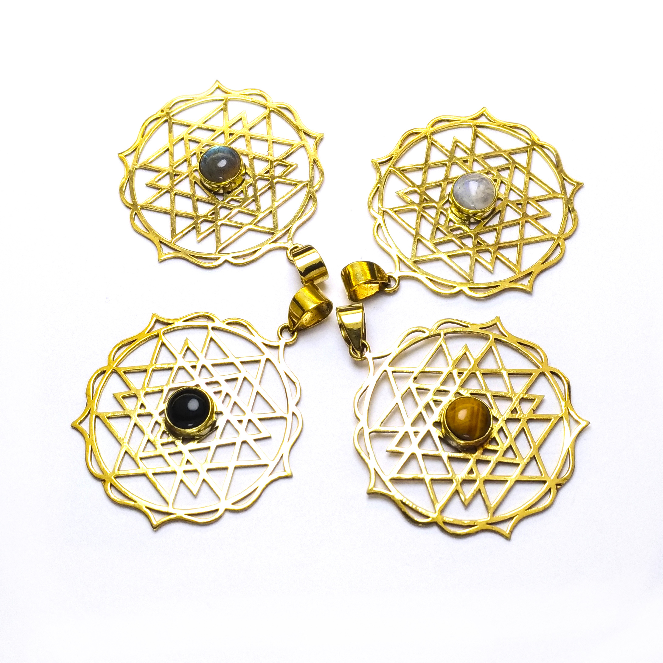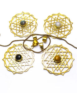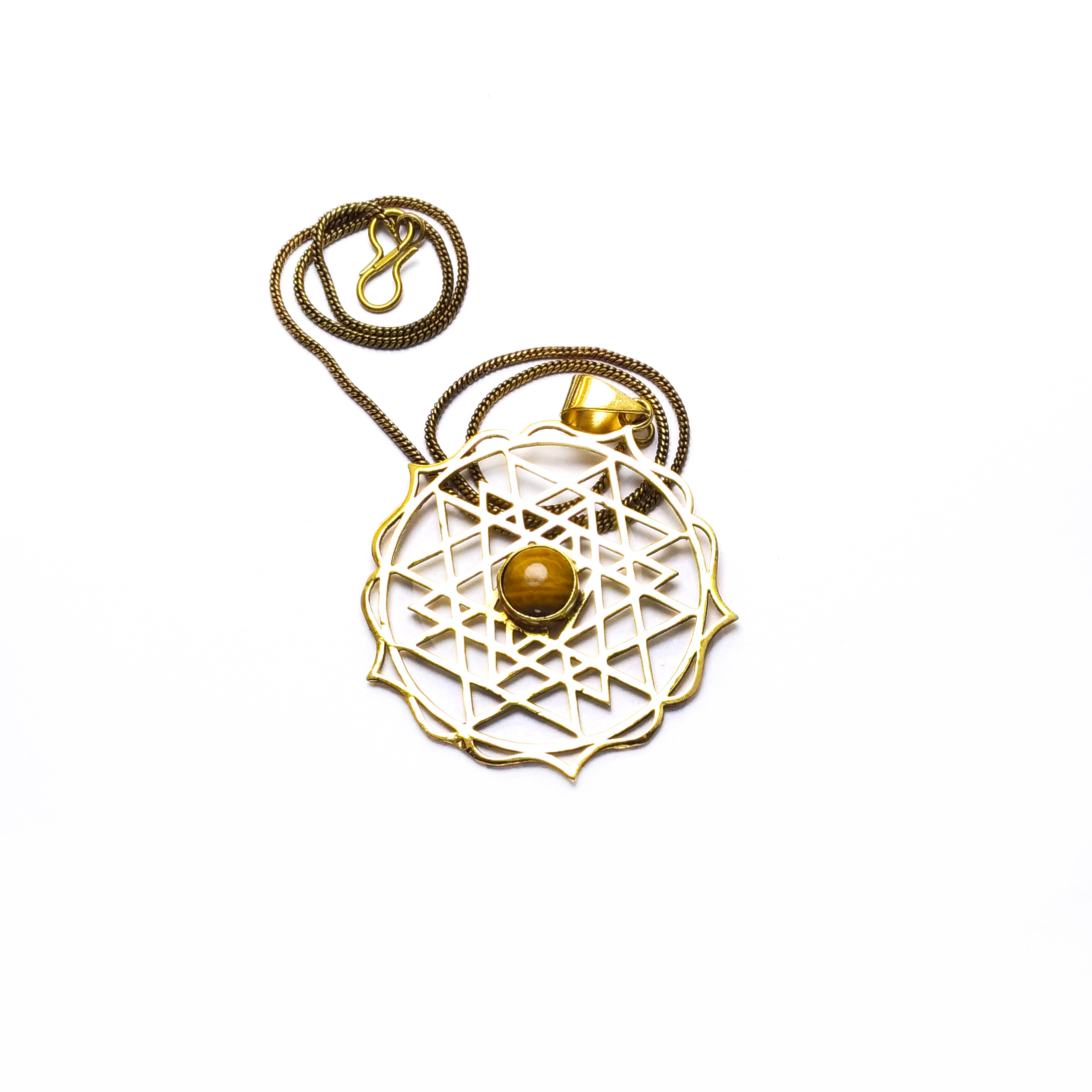 O colar Sri Yantra é muito delicado e bem Desenhado. Uma mandala desenha um sri Yantra no qual se encontra um cristal ao centro. O Sri Yantra é um símbolo da geometria sagrada e um poderoso instrumento de meditação e libertação espiritual, união entre o mundo físico e espiritual. Colar todo feito em latão e banhado em prata.